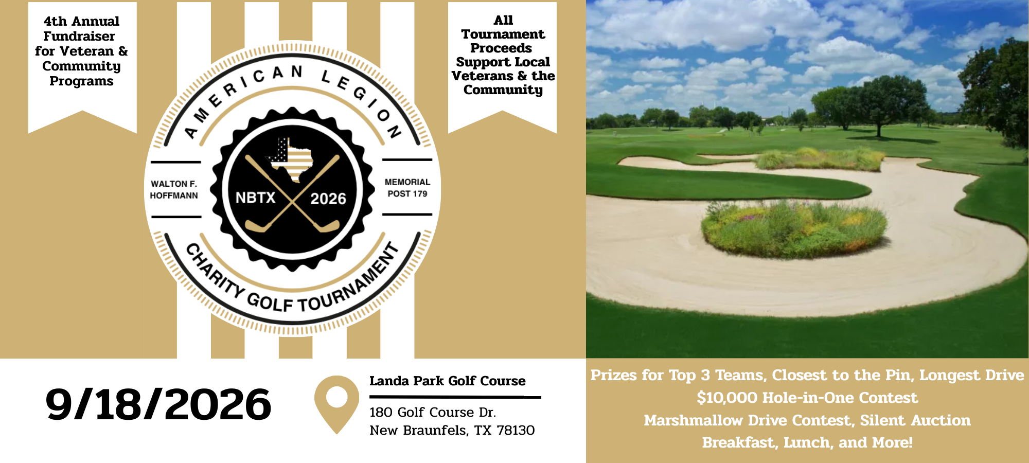Our passion for this tournament stems from our deep commitment to our causes. Through your sponsorship or participation, you directly contribute to our important mission - to enhance the well-being of America's Veterans, their families, our military, and our communities through our devotion to mutual helpfulness. Visit www.legion.org or www.alpost179tx.org to learn more about The American Legion and our post. All proceeds from this event benefit our post's four pillars of Veteran and community programs. So let's tee it up for local Vets and our community - register, donate, or sponsor us today!
